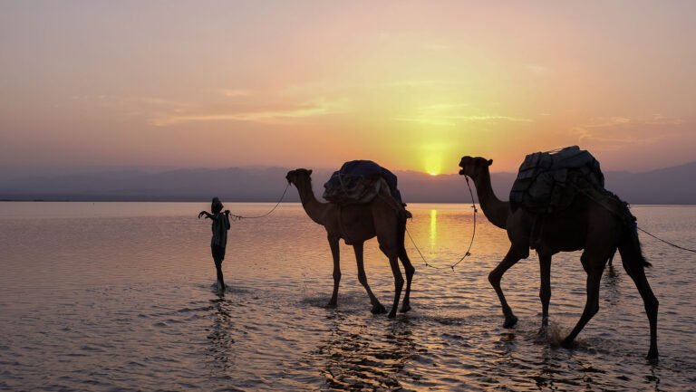 Au plus bas sous le niveau de la mer, au nord de la dépression du Danakil, une immense étendue horizontale jadis immergée puis asséchée sous une chaleur