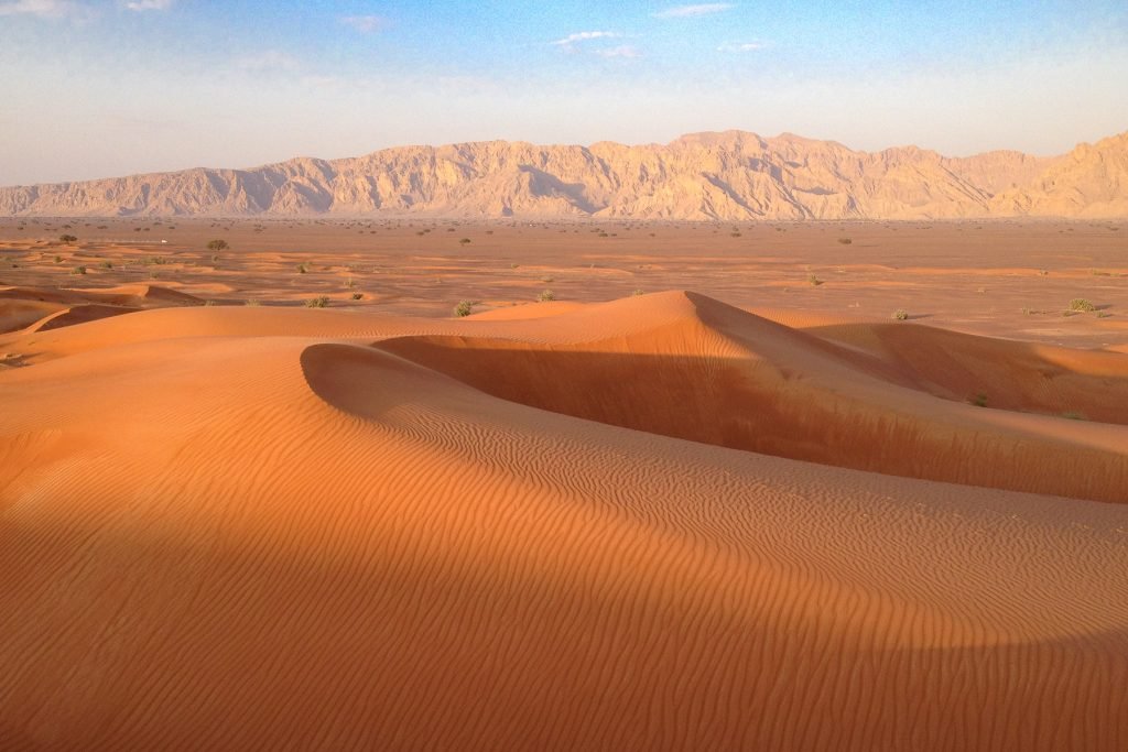 À la frontière entre les Émirats Arabes Unis et Oman, à l’Est de Dubai et au Sud de Al Madam et de Hatta, de magnifiques dunes rouges viennent lécher les premiers reliefs minéraux du Hajar occidental. Rencontres avec les dromadaires du coin. Ciel immense, dunes à l’infini, arêtes et ondulations de sable. Ambiance désert, silence et nuit étoilée, bivouac pour admirer coucher et lever du soleil.