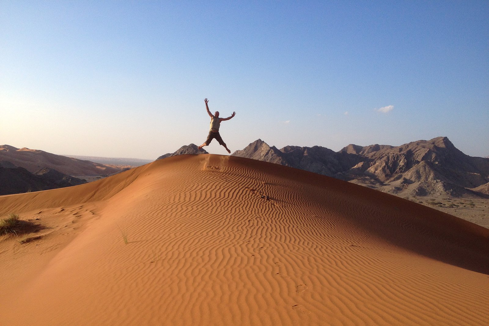 À la frontière entre les Émirats Arabes Unis et Oman, à l’Est de Dubai et au Sud de Al Madam et de Hatta, de magnifiques dunes rouges viennent lécher les premiers reliefs minéraux du Hajar occidental. Rencontres avec les dromadaires du coin. Ciel immense, dunes à l’infini, arêtes et ondulations de sable. Ambiance désert, silence et nuit étoilée, bivouac pour admirer coucher et lever du soleil.