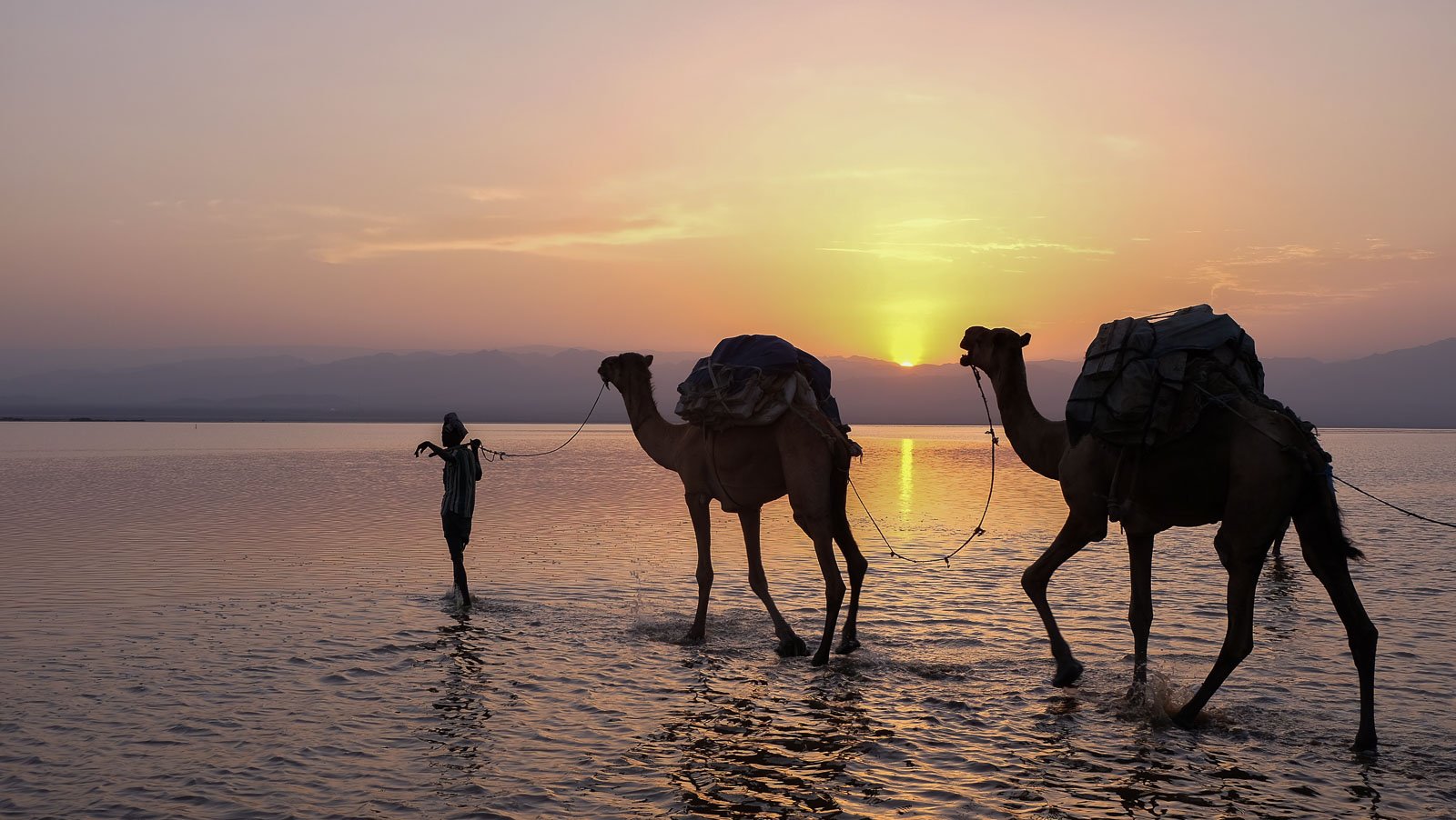 Au plus bas sous le niveau de la mer, au nord de la dépression du Danakil, une immense étendue horizontale jadis immergée puis asséchée sous une chaleur plus que caniculaire. Au sol, du sel résiduel dans des quantités quasi inépuisables, source d’un commerce millénaire. Les plaques de sel brutes sont extraites, taillées puis charger sur le dos des dromadaires et des ânes pour forme de longues caravanes en direction des hauts plateaux du Tigray. À la fin de la journée, au milieu du lac avec de l’eau jusqu’au bas des cheville, le spectacle est étonnant, les dernières caravanes du jour traversant sous un soleil couchant la surface des eaux. Moment absolument extraordinaire !