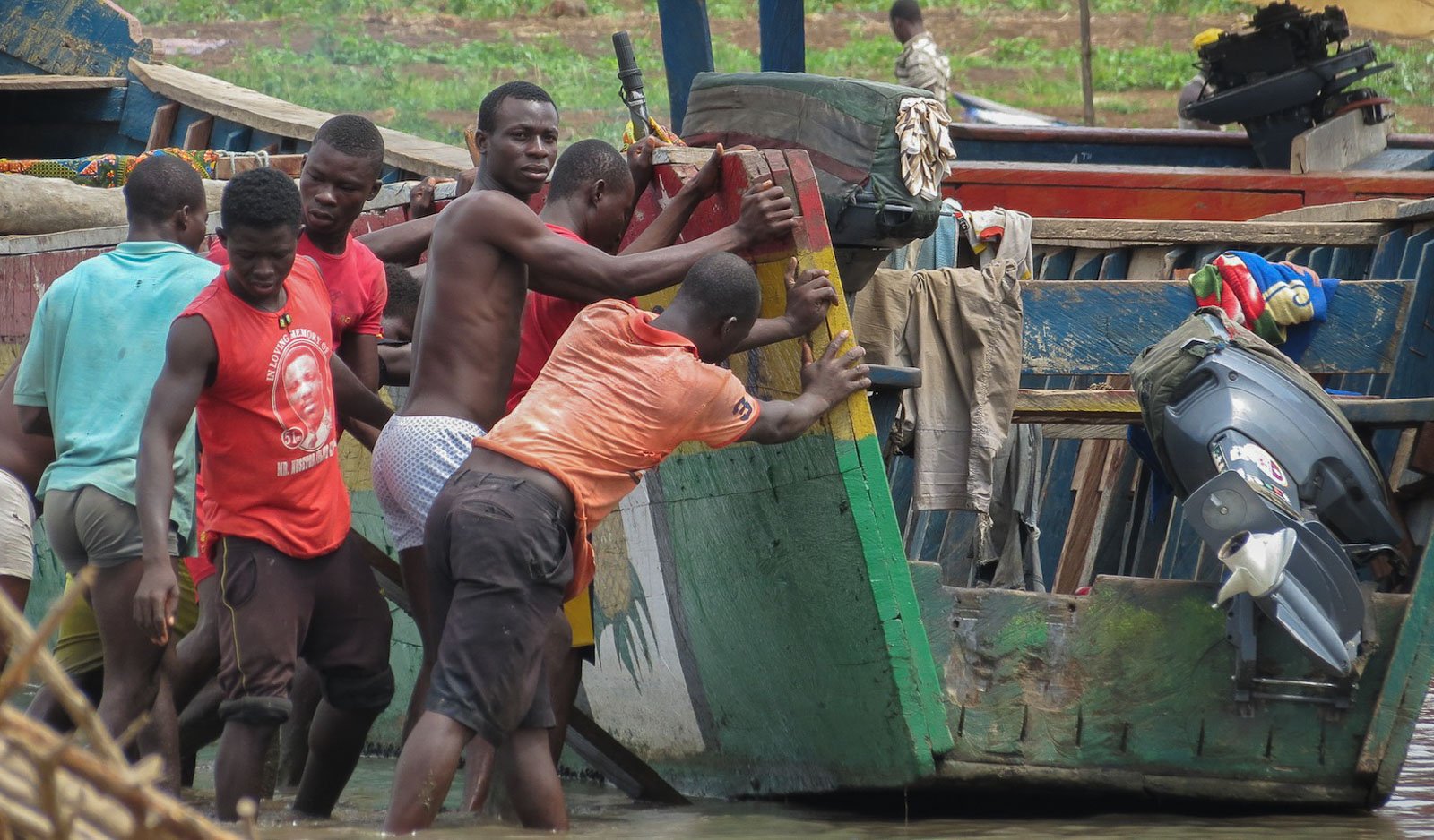 Sur les rivages du lac Volta, ça s’active: carénage et réfection des bateaux, embarquement et débarquement de marchandises, départ et arrivée de taxi boat, vendeurs ambulants. La lumière écrase le paysage, la ligne d’horizon se dédouble dans l’eau, on plisse les yeux, on cherche de l’ombre.