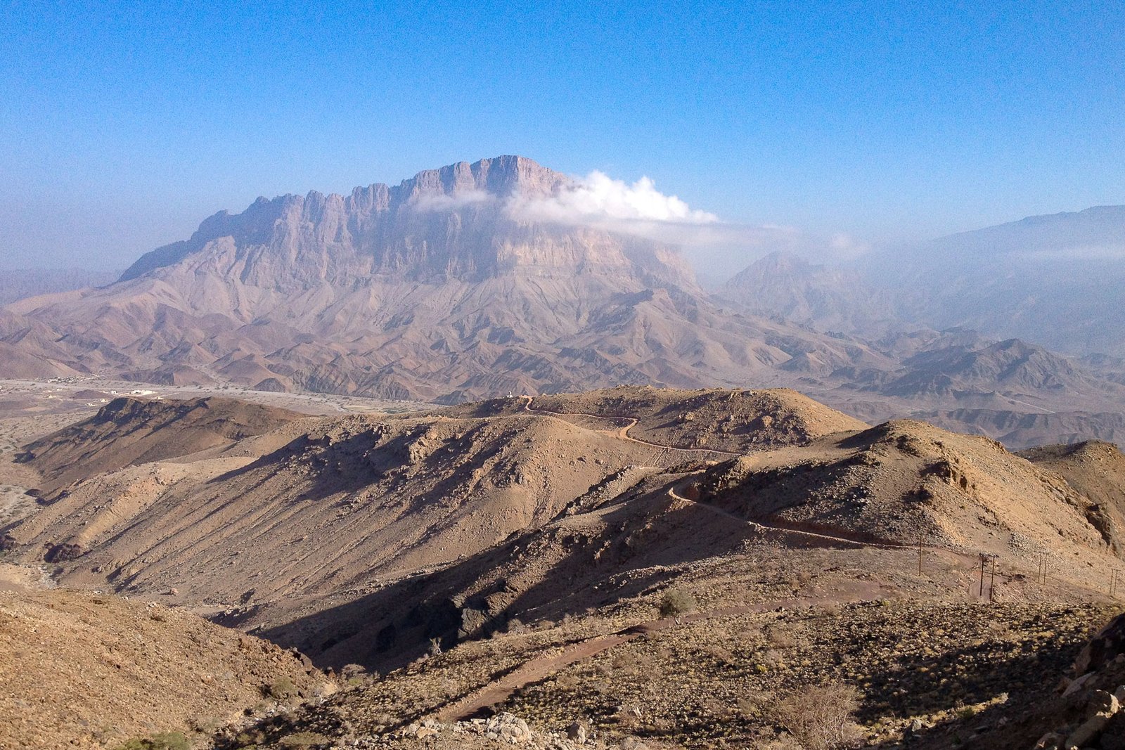 Décor minéral spectaculaire. Le Jebel Misht domine et ses ailes dentelées s’ouvrent de part et d’autre du pilier central, formant une sorte de peigne géant, d’où son nom, « la montagne peigne » Des premières lueurs du jour au coucher du soleil, le géant se teinte de rose, de rouge ou d’orange. Vue du sol, à ses pieds ou depuis le Jebel Kawar qui lui fait face, toutes les vues sont impressionnantes. À cet endroit, on trouve aussi 21 tombes en forme de nid d’abeille qui se dressent sur une arête caillouteuse, face au Jebel Misht, depuis plus de 3 000 ans.
