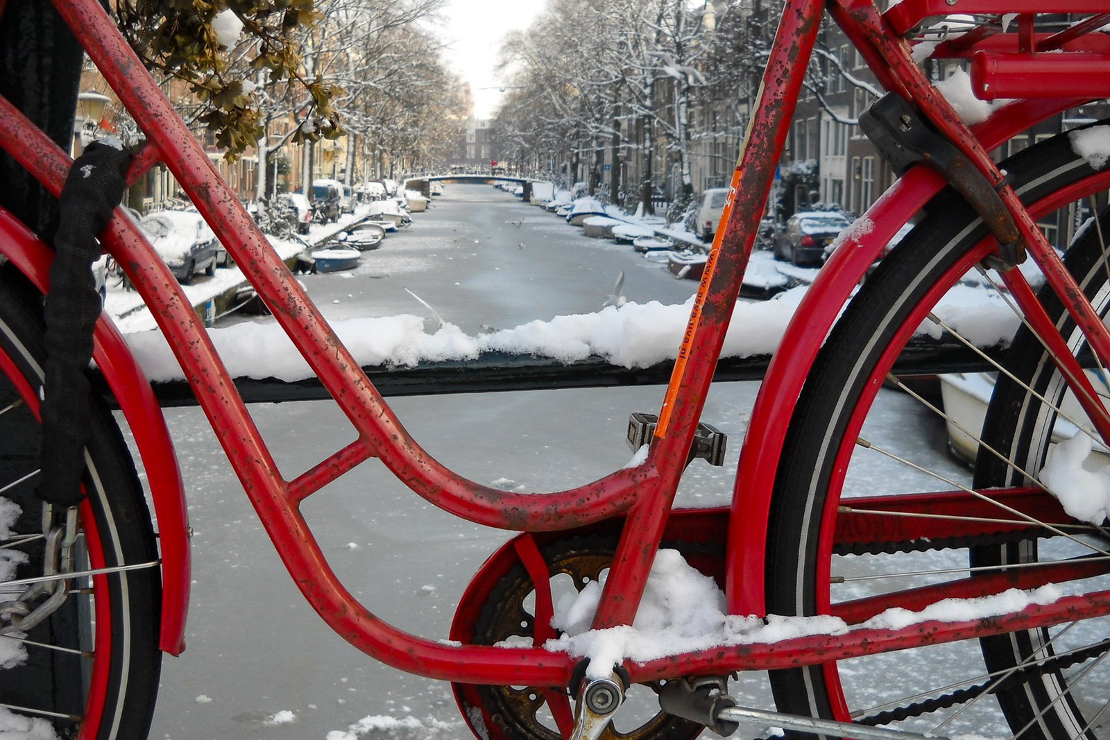 Virée entre La Haye et Amsterdam en conditions hivernales. Canaux gelés, ciel bas, littoral couvert de neige, façades boisées et colorées, vélos en tout genre, couleurs Flower Power, beaucoup de vélos, tempête de neige, un drôle d’oiseau, un lieu pour trouver l’extase et quelques moulins quand même dans la brume glacée…